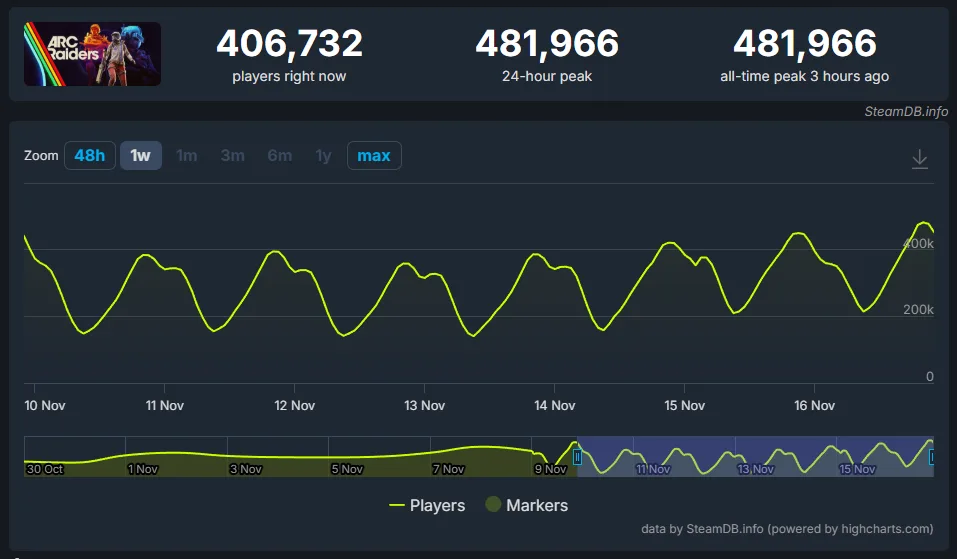 رغم المنافسة الشرسة، وصلت ARC Raiders هذا الصباح إلى 481,966 لاعبًا متزامنًا وهو يعتبر حتى الآن أعلى رقم في تاريخ اللعبة حتى اللحظة، وأحد أكبر الأرقام التي حققتها أي لعبة Extraction Shooter على الإطلاق، وبهذا الإنجاز، تُثبت أنها الأكثر شعبية ونجاحًا في هذا النوع، متفوّقة على عناوين راسخة مثل: