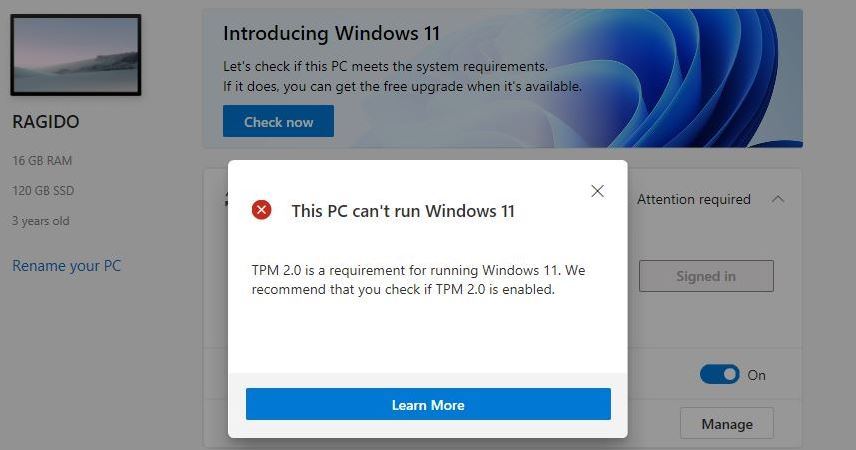 للتأكد أيضاً من أنّ جهازك قادر على تشغيل ويندوز 11، يمكنك استخدام أداة PC Health Check الرسمية من مايكروسوفت كما تحدثنا في تقرير طريقة تحميل وتثبيت Windows 11 سابقاً. في حال كانت التقنية غير موجودة أو فعالة في جهازك، ستحصل على الخطأ التالي (كما حدث معي).