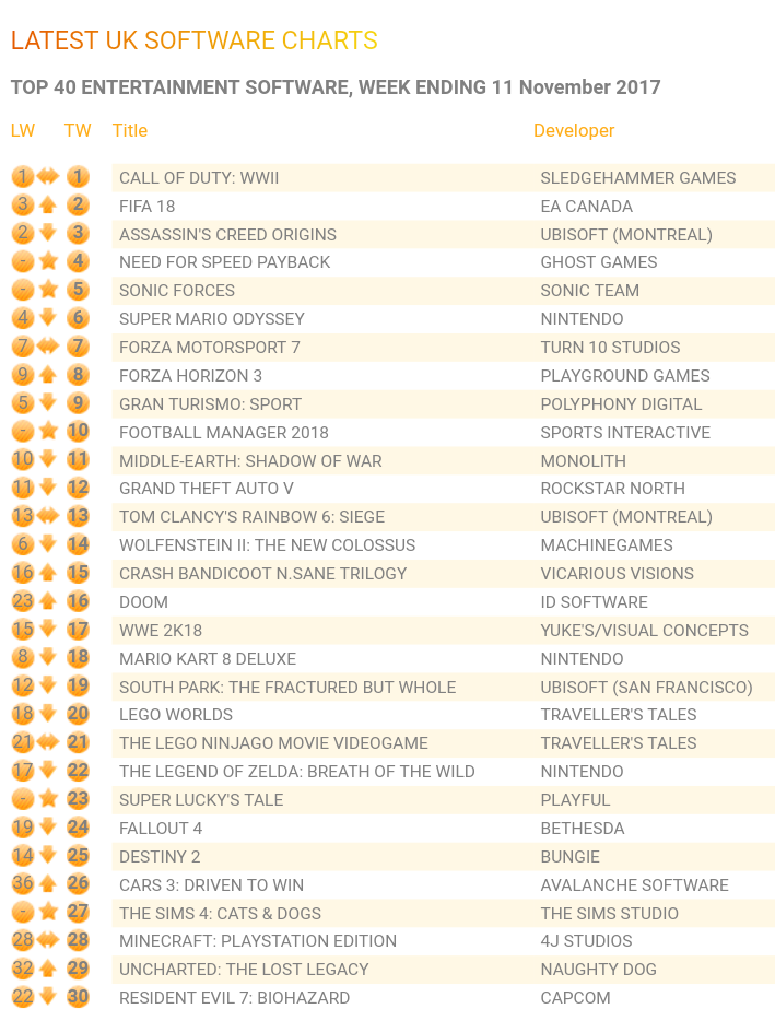نعم، تعود بالمجد، و تعيد بذلك كرامة و هيبة السلسلة، لعبة CoD: WWII تتصدر المبيعات البريطانية للأسبوع الثاني على التوالي متغلبة بذلك على لعبة Need For Speed: Payback, حيث حلت هذه الأخيرة رابعة في الترتيب بشكل غير متوقع و مخيب لأمال مطوريها.