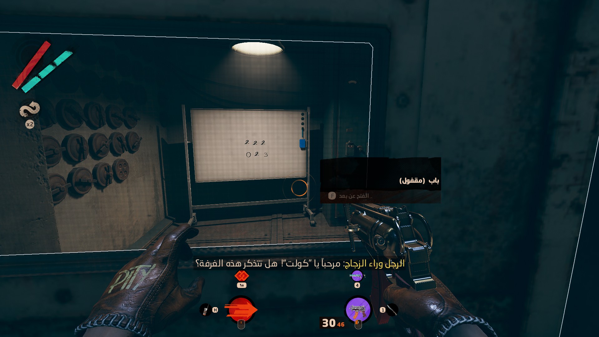 الآن بعد دخولك وبمجرد حديث الرجل خلف الزجاج، توجه إلى الباب ومن خلال النظر من الزجاج الموجود على الباب ستعثر على رقمين مختلفين كما في الصورة أعلاه. بالنسبة لنا هذه الأرقام كانت 222 و 023 ولكنها تختلف من لاعب آخر لذلك من الأفضل أن تتحقق بنفسك.