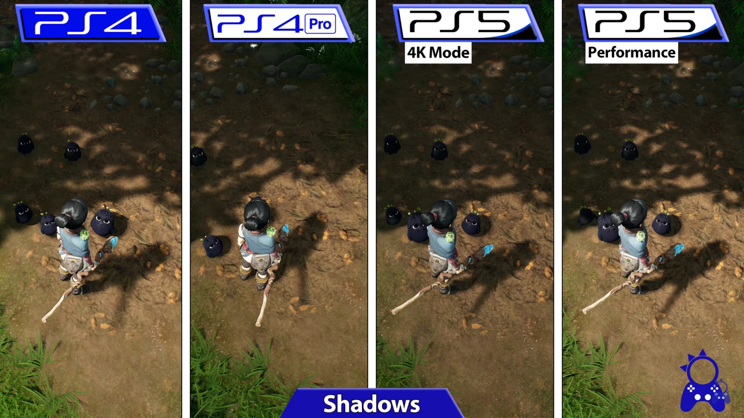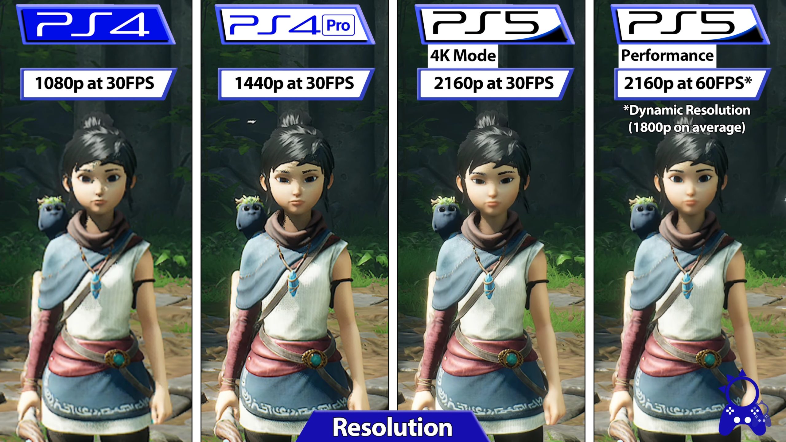 كما تشاهدون في الصورة ستعمل نسخة Kena: Bridge of Spirits على جهاز بلايستيشن 4 بأداء متفاوت ما بين 30 الى 28 إطار/ث بالإضافة الى دقة وضوح 1080 بيكسل، بينما استطاعت نسخة بلايستيشن 4 برو أن تصل الى دقة Ultra HD 1440 بيكسل، وأداء ثابت عند 30 إطار/ث.