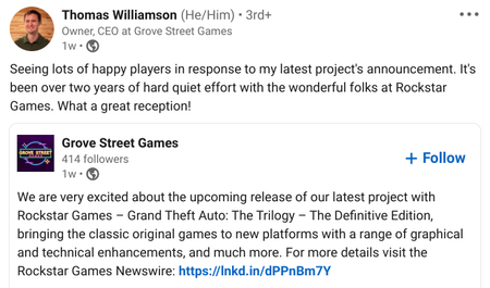 وفقا لمنشور على موقع LinkedIn قادم من الرئيس التنفيذي لشركة Grove Street Games، وهم المطورين الذين يقبعون وراء تطوير GTA The Trilogy بنسخة Definitive، بحسب ما ذكر ان الثلاثية المعاد تصميمها قيد التطوير لأكثر من عامين، كشفت روكستار أن عمليات إعادة التشكيل كانت تقوم بها الشركة المذكورة قائلة: