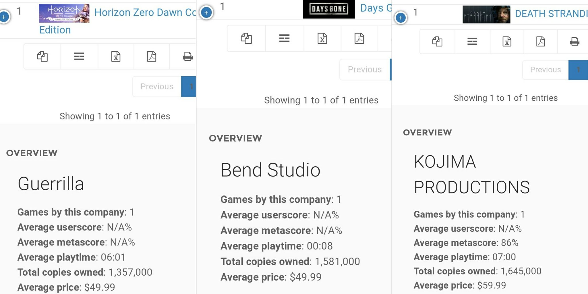 استديو Kojima Production المملوك للمخضرم كوجيما ومن خلال لعبة Death Stranding كذلك باعت أكثر من 1.6 مليون نسخة على الحاسب الشخصي، بينما استديو Guerrilla المعروف بلعبة Horizon Zero Dawn تمكنت من بيع ما يقارب 1.4 مليون نسخة على الحاسب من خلال متجر ستيم الرقمي.