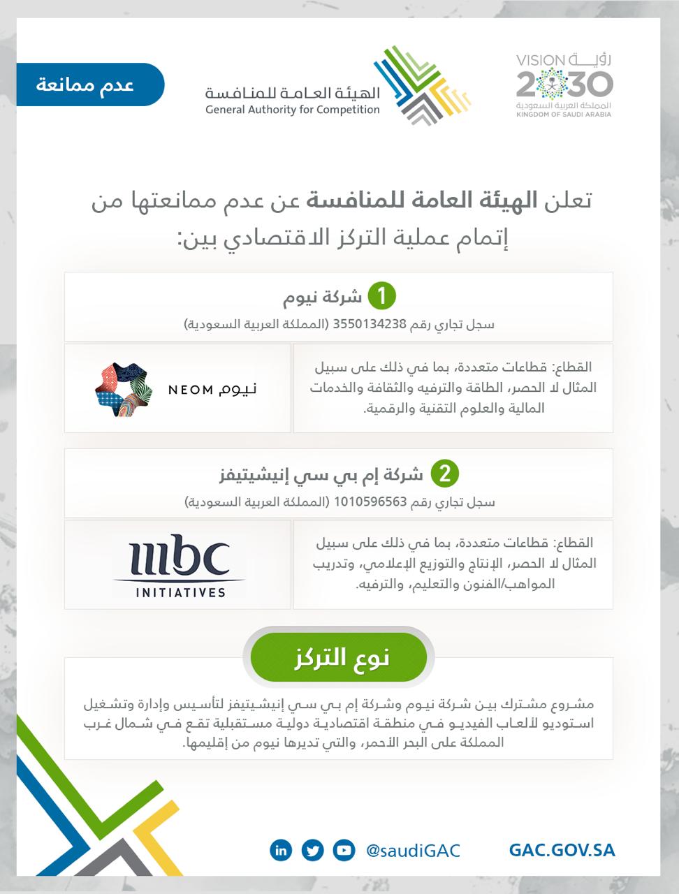 فقد أعلنت الهيئة العامة للمنافسة عبر بيان رسمي صدر هذا اليوم ونشرته مجلة سبق الإلكترونية، عن عدم ممانعتها من أجل إنشاء مشروع مشترك بين شركة نيوم و شبكة MBC Initiative التابعة لمجموعة MBC القابضة المحدودة، حيث أفادت الهيئة العامة للمنافسة بأن المشروع المشترك الجديد سيقوم بتنفيذ وإدارة وتشغيل وتطوير الألعاب ذات الفئة AAA في مدينة نيوم.