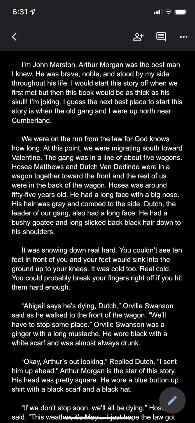 عبر موقع Reddit، كشف احد اللاعبين عن تحويل قصة لعبة Red Dead Redemption 2 الى كتاب ليهديه الى ابيه الذي لا يعلب الا العاب الليجو لانها سهلة التحكم، ولان اللعبة رائعة بحسب وصف اللاعبين كان عليه ان يجد طريقة ليوضخ لابيه كم هي تبدر كذلك ولم يكن بالامكان ابدا ان يقنع ابيه بلعب اللعبة فما كان له الا ان قام بتحويلها الى كتاب، اليكم صورة ادناه عن الصفحة الاولى منه.