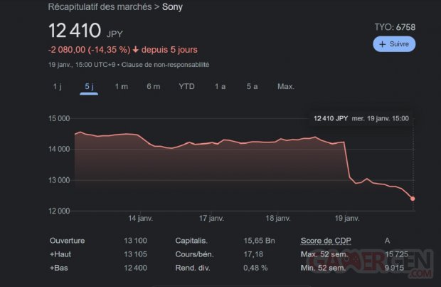 بعد إعلان صفقة الاستحواذ على أكتيفجن بقيمة مقابل 68 مليار دولار بالأمس، استمرت قيمة أسهم سوني بالخسارة بنسبة 13 بالمائة، وهو وما يعادل 20 مليار دولار، وهو ما يمثل انخفاض حاد في القيمة السوقية، وهي تعتبر أكبر خسارة لشركة سوني منذ أكتوبر 2008، حيث خسرت 20 مليار دولار من قيمة الشركة في يوم واحد فقط.
