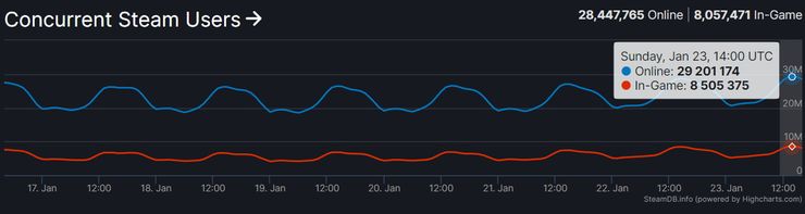 قبل ثلاثة أسابيع، استهلت منصة Steam العام الجديد بتحقيقها لرقم قياسي في عدد اللاعبين النشطين بواقع 28 مليون لاعب، وبعدها بأسبوع ارتفع العدد 200 الف لاعب وبعد بأسبوع اخر حطمت الرقم ووصلت الى 29 مليون لاعب نشط، اليوم المنصة تسجل اعلى نسبة للاعبين النشطين منذ اطلاقها بواقع 30 مليون لاعب حسب موقع SteamDB.