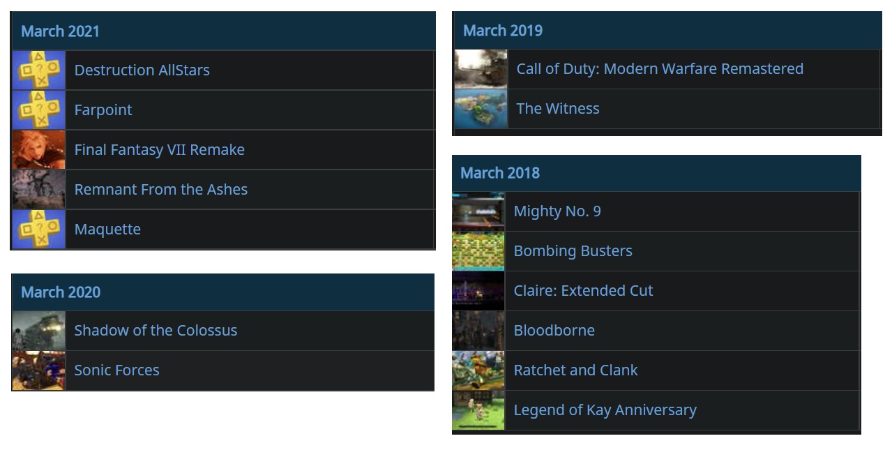 وكما ترون بالأعلى، فإن تشكيلات ألعاب شهر مارس السابقة قد احتوت على بعض العناوين المتميزة للغاية. مثل Bloodborne و Call Of Duty: Modern Warfare Remastered و Final Fantasy VII Remake و Shadow Of The Colossus. وهذه بالطبع كانت ألعاب قوية وقدمت اضافة جيدة للخدمة لا غبار عليها. لذلك قد يحمل معه الشهر المقبل حزمة متميزة بعد هذا الجفاف الذي استمر لعدة شهور.