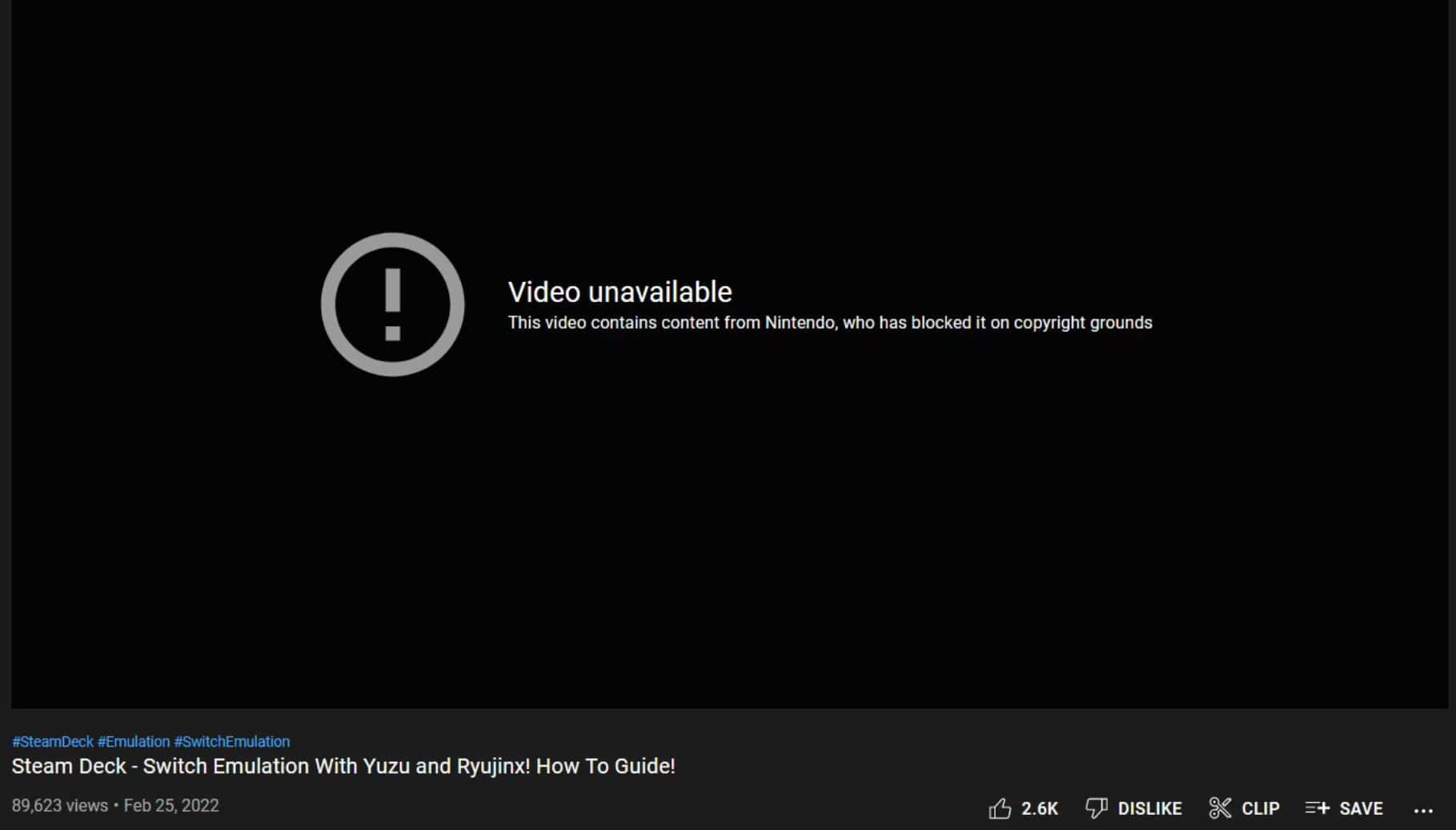 أوضح المستخدم dex3108 على موقع ResetEra، بأنه تمت إزالة مقطع فيديو نشره Phawx على اليوتيوب يوضح مدى قدرة Steam Deck على محاكاة عناوين Nintendo، وسبب الحظر كان على انتهاك أساس حقوق النشر.