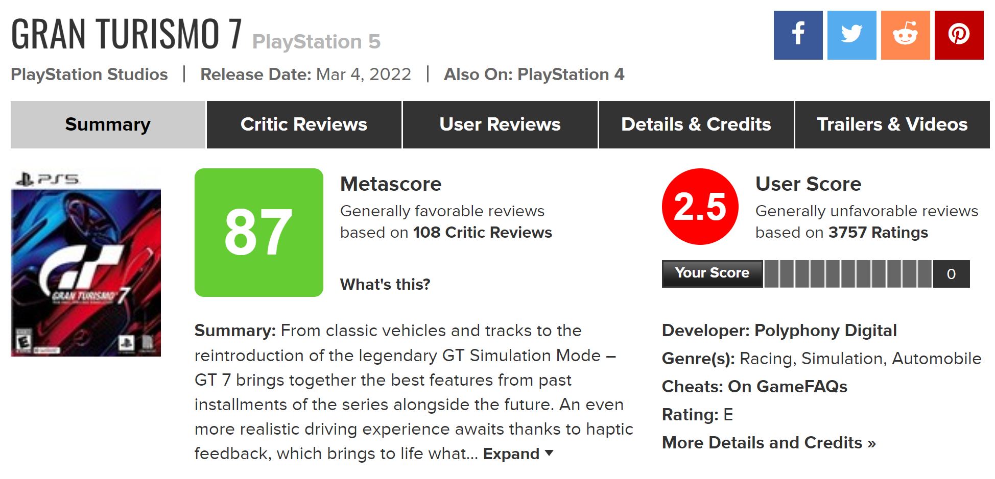 رغم عودة سيرفرات اللعبة الى العمل بشكل طبيعي مرة أخرى بعد 24 ساعة من تعطلها، تعرضت Gran Turismo 7 الى هجمة شرسة في تقييماتها على موقع Metacritic هي الأكبر بالنسبة لعنوان بلايستيشن وحصرية من حصريات شركة سوني من قبل اللاعبين، بسبب تعطل اللعبة وكذلك سبب سياسة دفع الأموال عبر نظام المعاملات الدقيقة أو المشتريات داخل اللعبة.