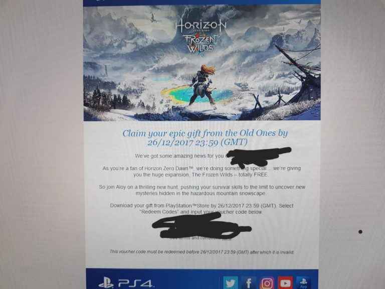 مازالت سوني تقدم المفاجأة للمشتركين عبر شبكة البلايستيشن بشكل عام و الحسابات الامريكية بشكل خاص حيث استهلتها الليلة الماضية بارسال بريجد الكتروني للمشتركين بشكل عشوائي يحتوي على كود تفعيل لاضافة لعبة Horizon Zero Dawn الجديدة Frozen Wilds مجانا و التي تستحق التجربة و يمكنكم الاطلاع على تقيمنا للاضافة هنا.
