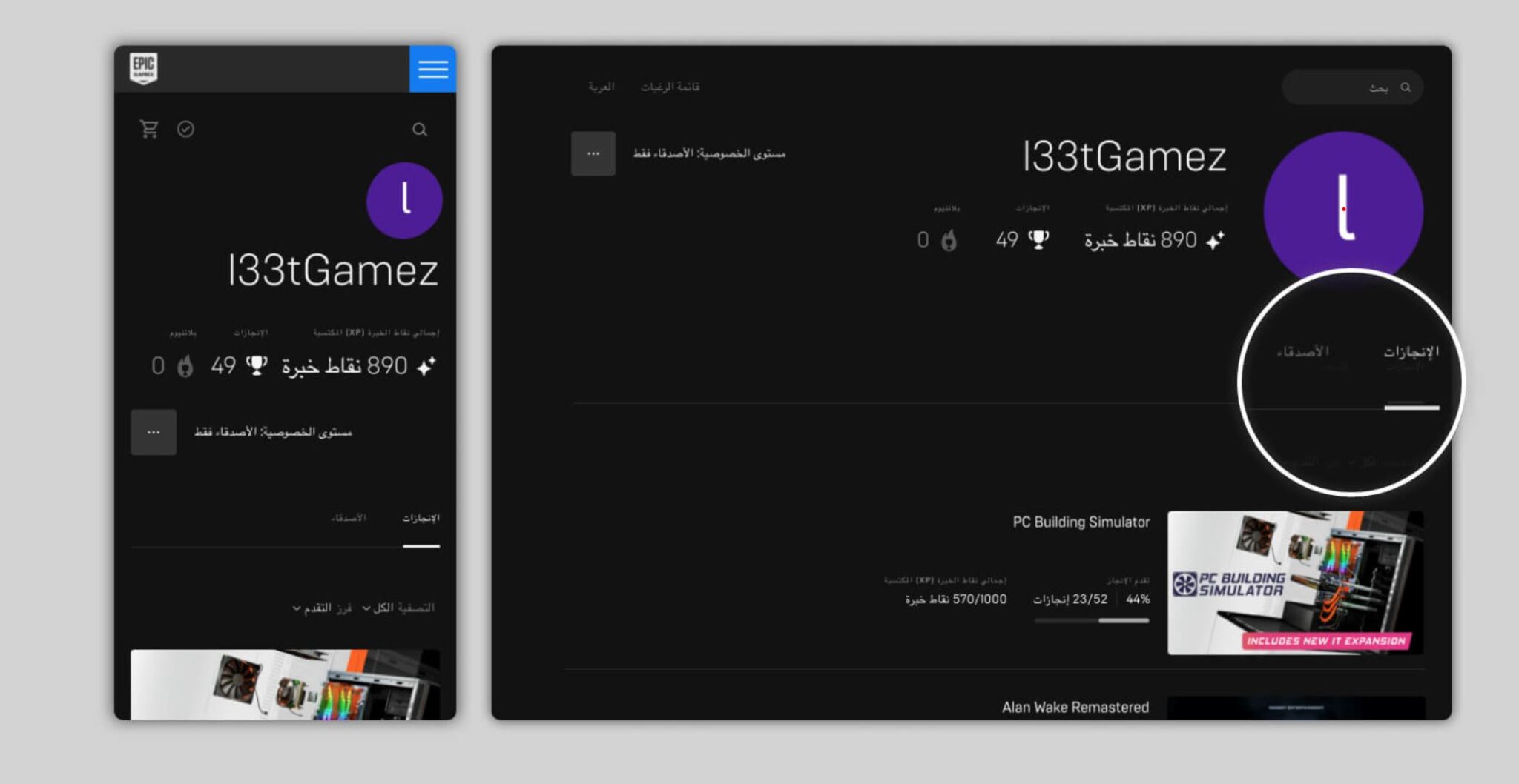وصف ميزة إنجازاتي في مشغل متجر Epic Games Store