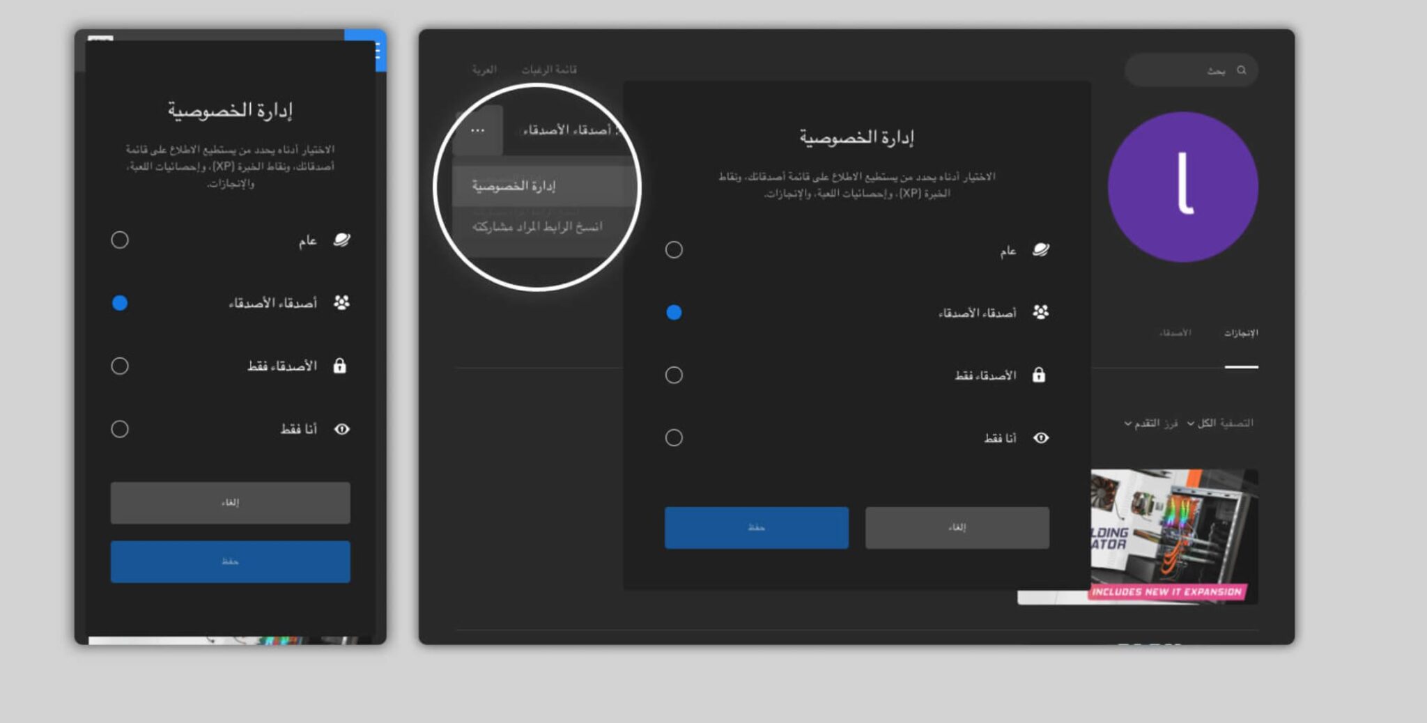 ستظهر الصفحات العامة كل عنصر من عناصر صفحتك. سيرون إنجازاتك وتقدمك المُحرز وقائمة أصدقائك. فإذا قمت بتعيين حسابك بحيث يقيد إمكانية الوصول إلى الأقسام المحددة أعلاه، فلن يتمكن أي أحد خارج هذه الفئات من رؤية أي شيء سوى الاسم المعروض والصورة الرمزية الخاصة بك.