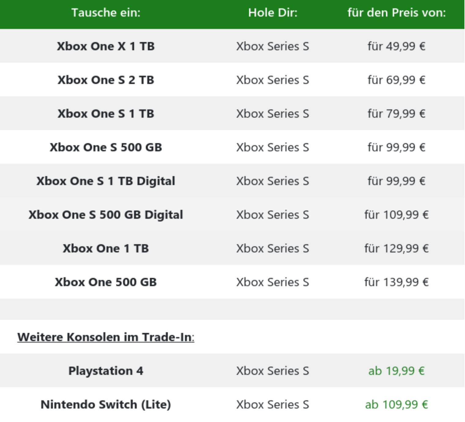 أعلنت شركة Microsoft بالتعاون مع متاجر GameStop داخل جمهورية ألمانيا أنه بإمكان الحصول على وحدة تحكم جديدة من نوع Xbox Series S جديد تمامًا مقابل وحدة التحكم Xbox القديمة او وحدات التحكم الأخرى مقابل تكلفة إضافية، وهو عرض سيستمر فقط من الفترة 8 أبريل حتى 5 مايو.