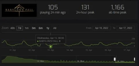موقع TechRadar قال ان لعبة Babylon’s Fall فشلت الاسبوع الماضي في جذب 100 لاعب على منصة Steam وحاليا هناك فقط 10 لاعبين متزامنين يلعبونها او اقل حتى بحسب احصائيات SteamDB.