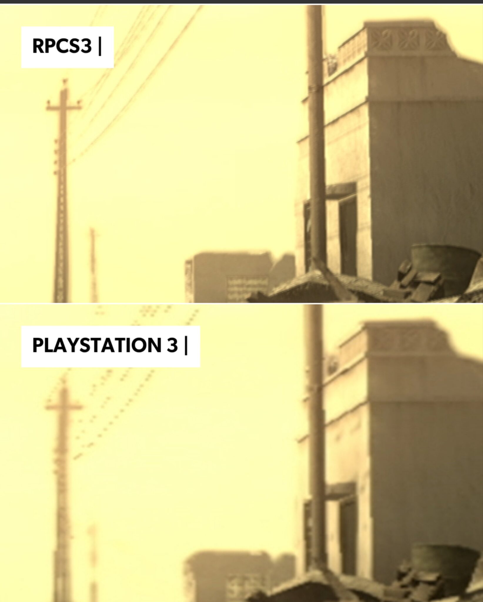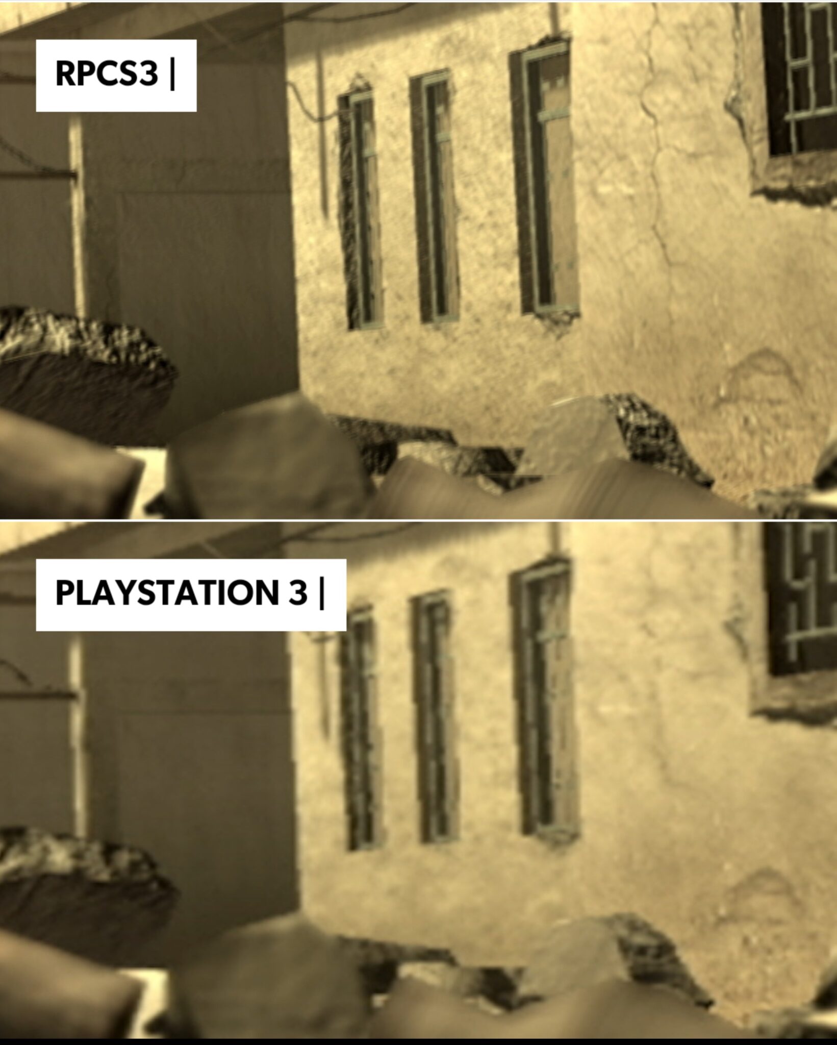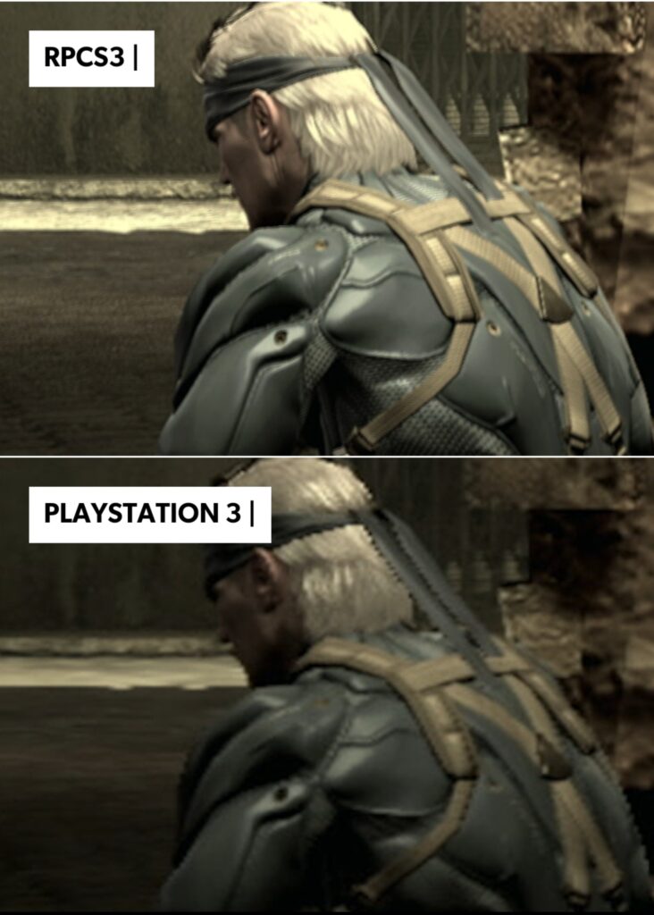 اما مع المحاكي الامور كانت صعبة ولكنها استحقت كل المجهود المبذول، يحاكي RPCS3 وحدات SPU على وحدة المعالجة المركزية وكلما زاد استخدام SPU للمطور المستخدم في أي لعبة معينة زاد العبء في محاكاة اللعبة بسرعات أصلية ناهيك عن مضاعف الأداء الذي تسعى من خلاله الوصول إلى 60 إطارًا في الثانية، اليكم مقارنة واضحة للفرق في الدقة بين تشغيل اللعبة على المحاكي وتشغيلها على جهاز بلايستيشن 3 ادناه.