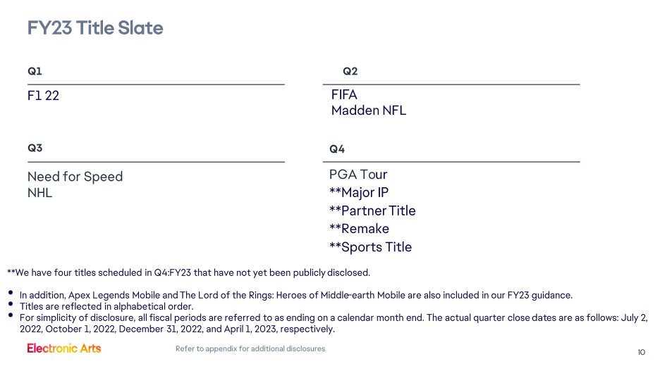 وبالتزامن مع تلك الأحداث، كشفت شركة EA عن قائمة الألعاب القادمة خلال العام المالي المقبل 2023، حيث يستعد الناشر لتطوير أربعة عناوين ألعاب غير معلنة قادمة في الربع الرابع من العام المقبل، حيث تم إدراج هذه القائمة في قسم “Q4” في عرضها التقديمي.