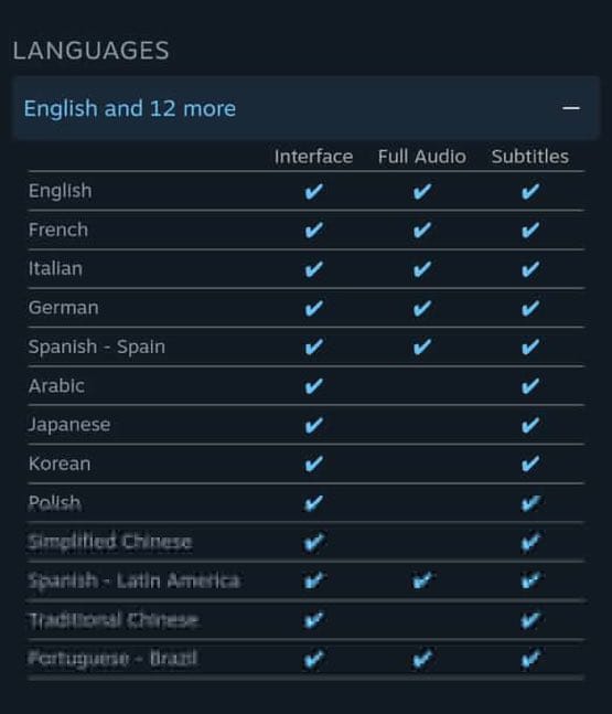 لكن الخبر الاهم وهو دعم اللعبة للغة العربية عند الاطلاق كترجمة للقوائم والنصوص والحوارات بدون الدبلجة كما اظهرت صفحة اللعبة على متجر Steam وكما تشاهدون ادناه.