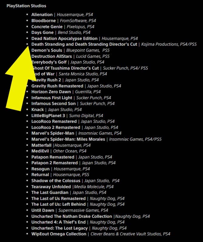 ربما بسبب امتلاك سوني لحقوق لعبة Death Stranding الكاملة يبرر لها اضافتها ضمن قوائم العاب الطرف الاول، رغم استخدام وصف “استديوهات بلايستيشن” بدل “العاب الطرف الاول” او “حصريات بلايستيشن”. ربما كان اولى ان يتم وضع اللعبة ضمن عناوين الطرف الثالث خاصة انها ليست حصرية مطلقة وقد صدرت على الحاسب الشخصي، لكن هذا ليس مبرر.