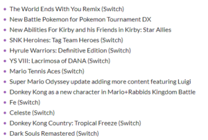 من بين ما جاء في الفيديو هو الكشف عن قدوم لعبة Dark Souls بنسخة ريماستر حيث تم استعراض جزء صغير من اللعبة في نهاية الفيديو و ستصدر في تاريخ 25 مايو (5) من هذا العام بجانب عدد من الالعاب الرائعة مثل Donkey Kong و The World Ends With You Remix و المزيد من الالعاب الاخرى التي يمكنكم الاطلاع عليها بالاسفل.
