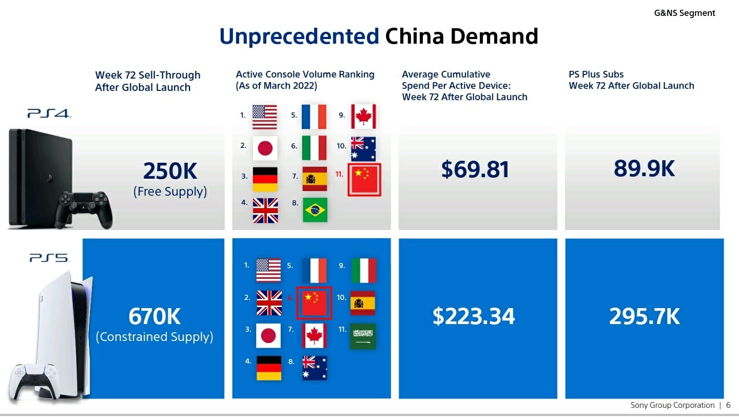 هذه الشريحة التفصيلية تظهر بشكل كبير مدة نجاح وحدة تحكم الجيل الجديد PS5 منذ إطلاقه بالأسواق خلال نهاية عام 2020، وتظهر كذلك حجم الطلب الكبير عليه، بالإضافة الى متوسط إنفاق المستخدمين الذي بلغ 70 دولار مع الجيل الماضي، PS4 بين وصل الى حدود 223 دولار مع PS5 بعد 72 أسبوعًا من الإصدار.