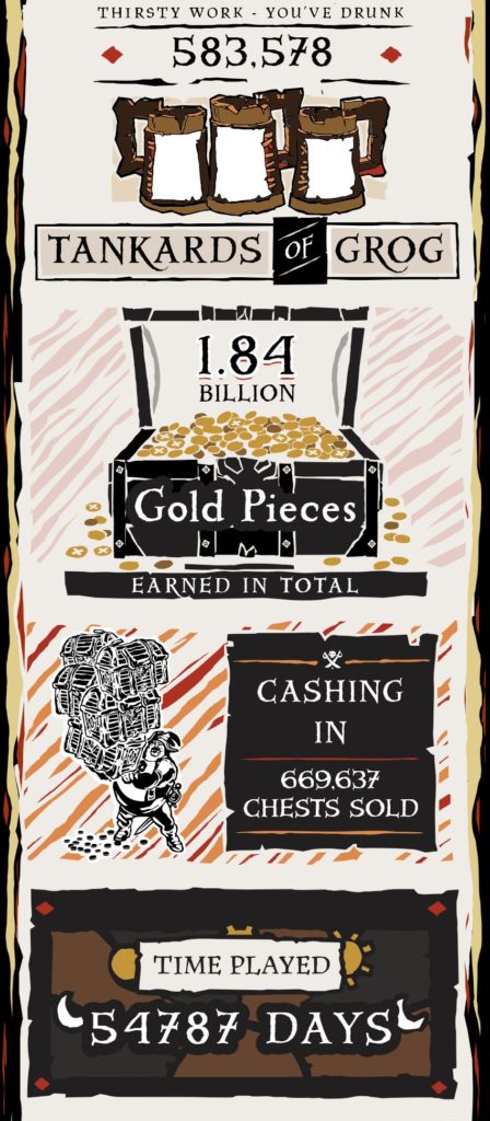 و حسب الاحصائيات فقد تم جمع اكثر من 1.84 مليون قطعة ذهب و اكثر من 669 صندوق تم بيعها في اللعبة, اما عدد ساعات اللعب فتم جمعها لتوازي 54,787 يوم كامل بينما تم اطلاق اكثر من 3,8 مليون قذيفة في عرض البحر.
