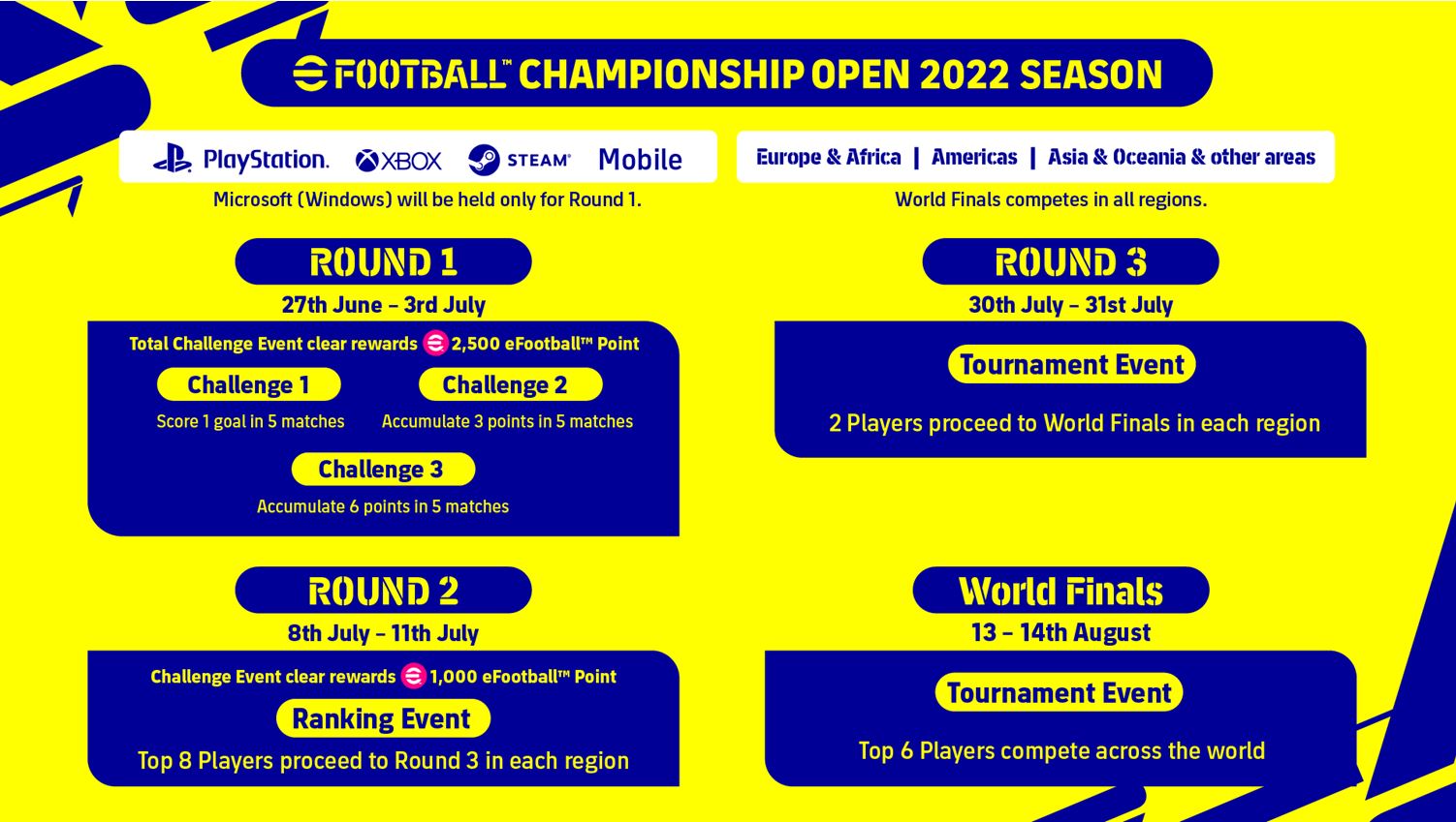 ستحوي eFootball Championship Open على منافسات علنية يتمكن مستخدمي eFootball 2022 من جميع أنحاء العالم بالانضمام و التنافس عبر عدد من المنصات منها: PlayStation 5 و PlayStation 4 و Xbox Series X|S و Xbox ONE و Steam .