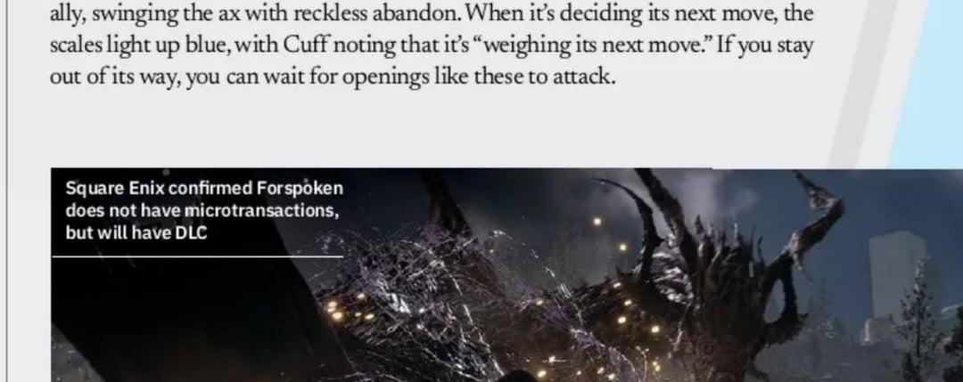أكدت شركة Square Enix الناشرة للعبة لمجلة Game Informer في عددها رقم 344، بأن لعبة المغامرات والأكشن والخيال Forspoken لن تحتوي على نظام مشتريات داخلي أو ما يسمى Microtransaction، وقد وتم نشر صورة المقالة من داخل المجلة التي تثبت صحة كلام الشركة كما نشاهد ادناه.