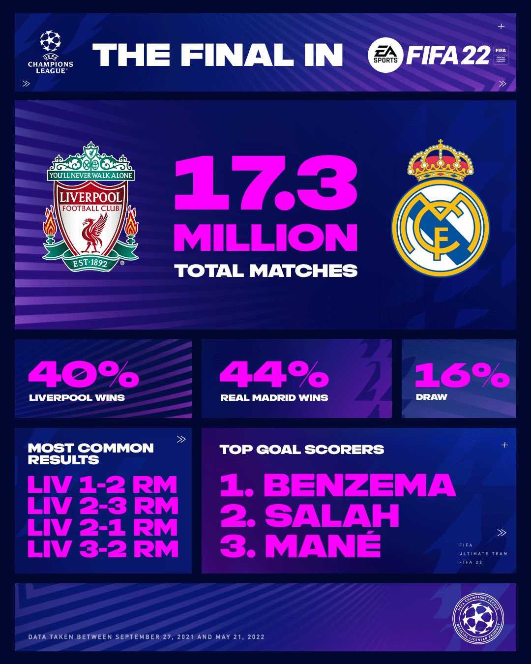 بالتزامن مع نهائي دوري ابطال اوروبا، EA تنشر احصائيات المواجهة بين ريال مدريد وليفربول في FIFA 22..