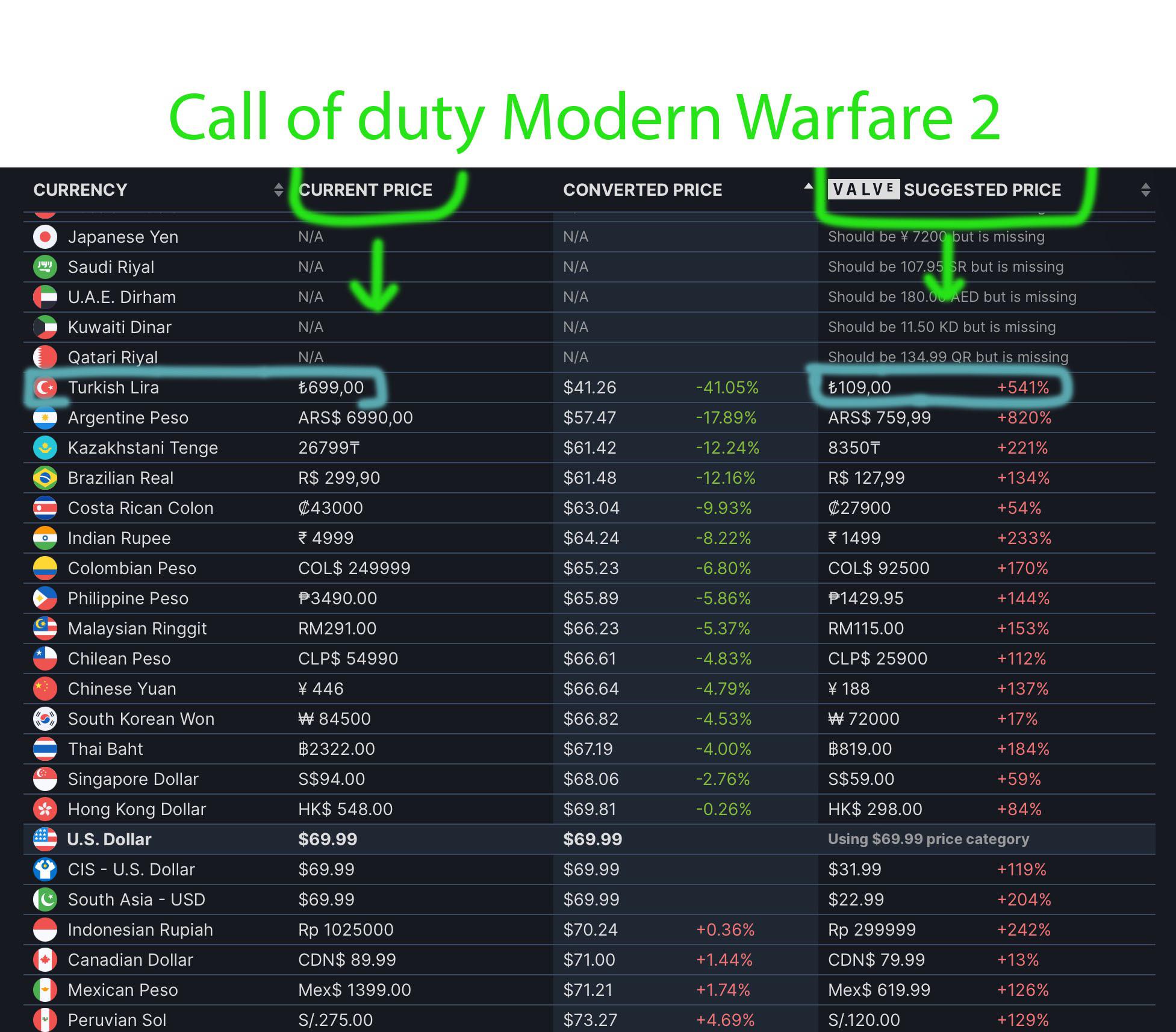 في تركيا مثلا، يبلغ متوسط دخل الفرد 525$ وأيضا من يريد شراء اللعبة بنسختها الرقمية سيدفع اكثر من سعرها الأصلي وهو 70$، وكذلك الامر بالنسبة لدول أخرى مثل الهند وكازاخستان وغيرها وهذا يتعلق بمنصة Steam فقط ولا يشمل المنصات الأخرى في الدول المذكورة.