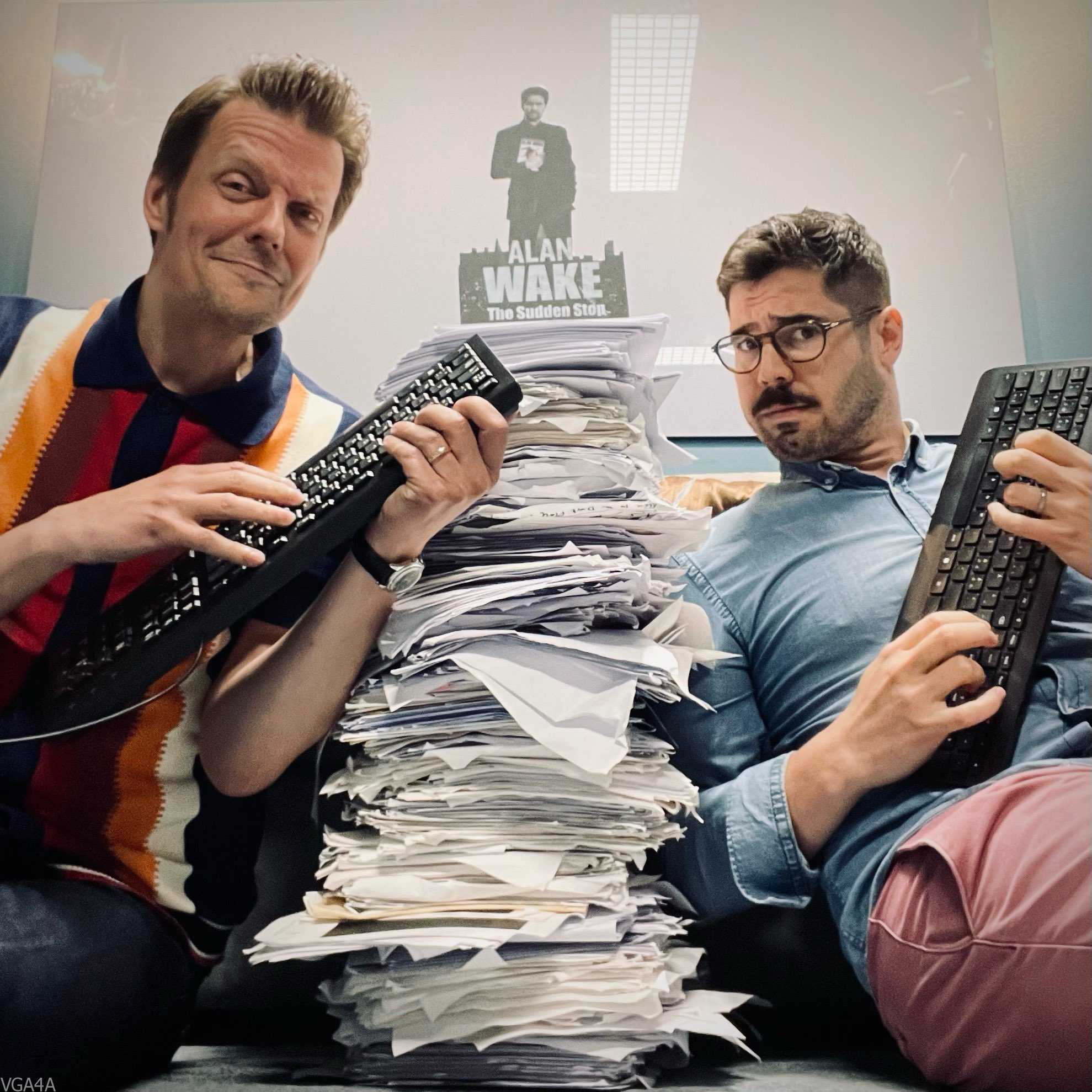 بدوره أضاف مورفي مازحا أن كاتبي القصة استخدموا “طريقة keytar للكتابة”، كما ترون في الصورة اعلاه وهذا النهج يتيح لهم إنهاء مهمتهم الشاقة بسرعة فائقة.