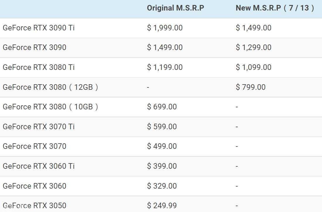 بعيدًا عن المضاربة ومشاكل التعدين التي تسببت في الارتفاع الجنوني لأسعار بطاقات RTX 30 Series، تعتبر أسعار البطاقات من تلك الفئة مرتفع بشكل نسبي مقارنة بمنافسيها عند صدورها، والآن بعد صدورها بفترة زمنية ووفقًا لما ذكره موقع Benchlife الصيني سيتم تخفيض أسعارها كما تشاهدون بالأسفل، رغم عدم كفاية التفاصيل وباقي الفئات.