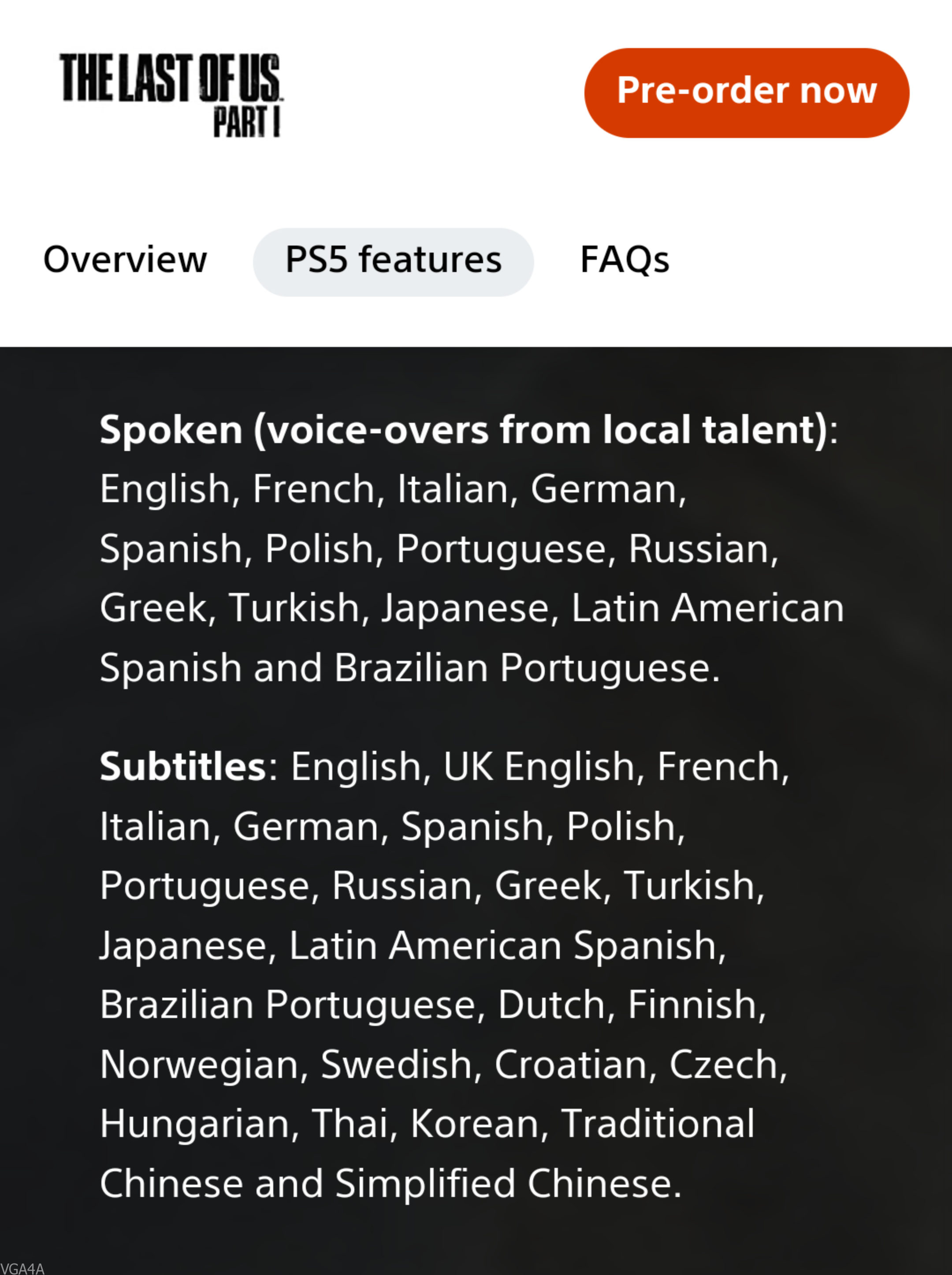 يمكن زيارة صفحة لعبة The Last Of Us Part 1 عبر موقع PlayStation الرسمي الان، عندها يمكنكم التوجه الى القسم الذي يجيب على اسئلة اللاعبين الشائعة واهمها ما هي اللغات المدعومة في اللعبة، ستجد انها تدعم اكثر من 25 لغة كدبلجة او ترجمة للقوائم والحوارات والنصوص من بينها الصينية والتايلاندية ولكن ليس للغة العربية اي مكان كما تشاهدون ادناه.