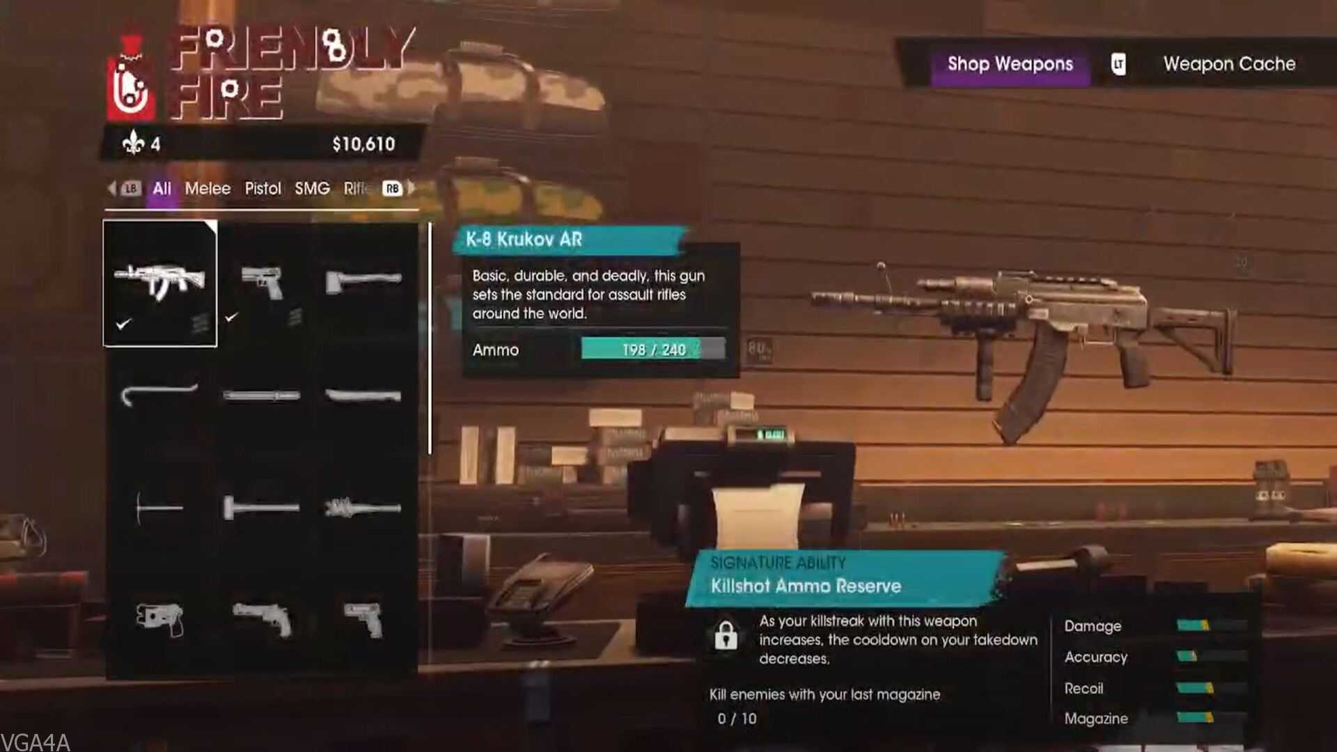 هناك الاسلحة الخفيفة مثل السكاكين والمطارق ومن ثم الاسلحة العادية مثل المسدسات بشتى انواعها وكذلك الاسلحة الثقيلة مثل الرشاشات واخيرا الاسلحة القوية المميزة، مثل قاذفات اللهب والصواريخ وغيرها.