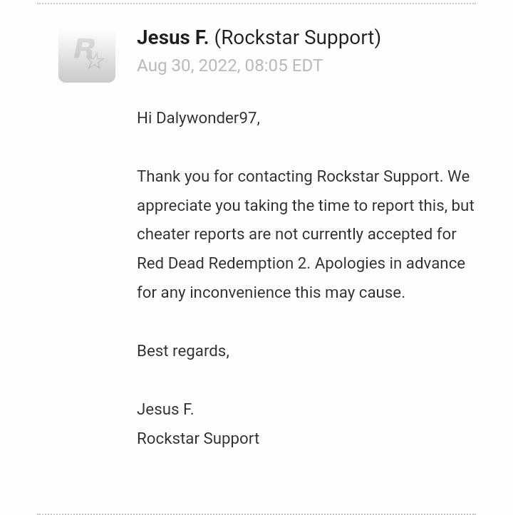 يقول محتوى الرسالة المرسلة من الشركة للاعب ان التقارير التي تخص الغشاشين لم تعد مقبولة بعد الان في لعبة Red Dead Redemption 2 بأكملها شاكرين له الوقت الذي امضاه في التبليغ ومعتذرين عن اساءة قد تواجه اللاعب بعد معرفته بتوقف الدعم.
