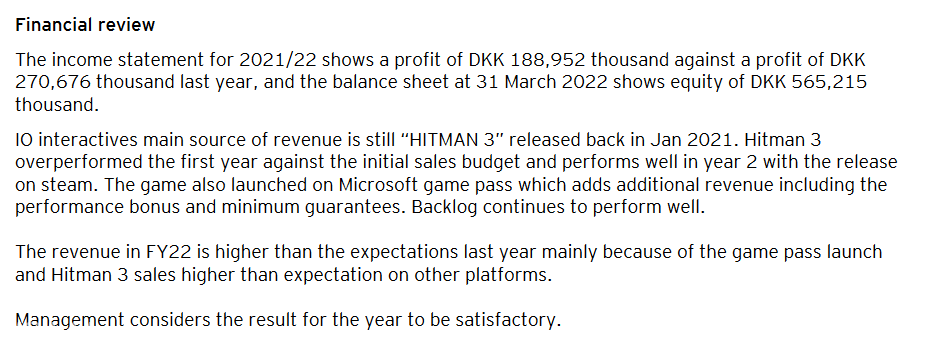 الاستديو قام بنشر تقاريره المالية السنوية التي تخص عامي 2021 و 2022 المنتهية في شهر مارس الفائت، وكما نشاهد ادناه بحسب ما نشر احد مستخدمي موقع تويتر، فإن ارباح الاستديو خلال العام المذكور اتت ضعف ما توقعته الادارة بفضل صفقة اطلاق ثلاثية هيتمان منذ اليوم الاول على خدمة Xbox Game Pass.