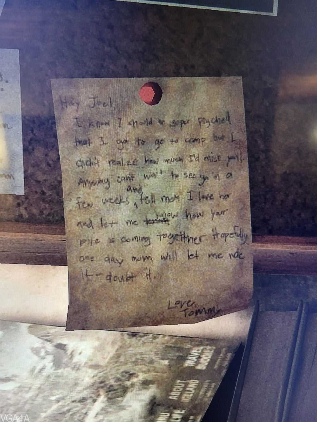 الرسالة كتبها تومي لاخيه جول عندما كانوا في مرحلة الطفولة، يمكن ايجادها في منزل جول بداية اللعبة، يقول محتوى الرسالة ما يلي: