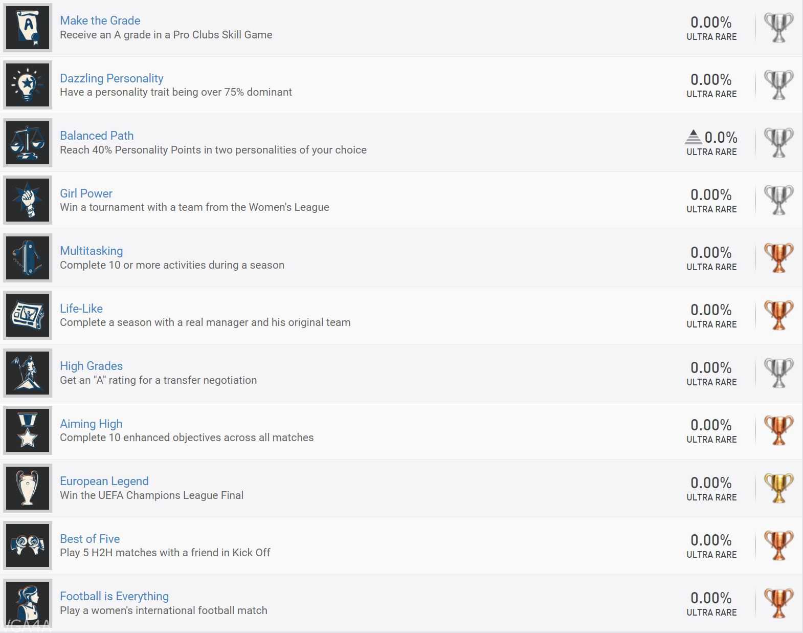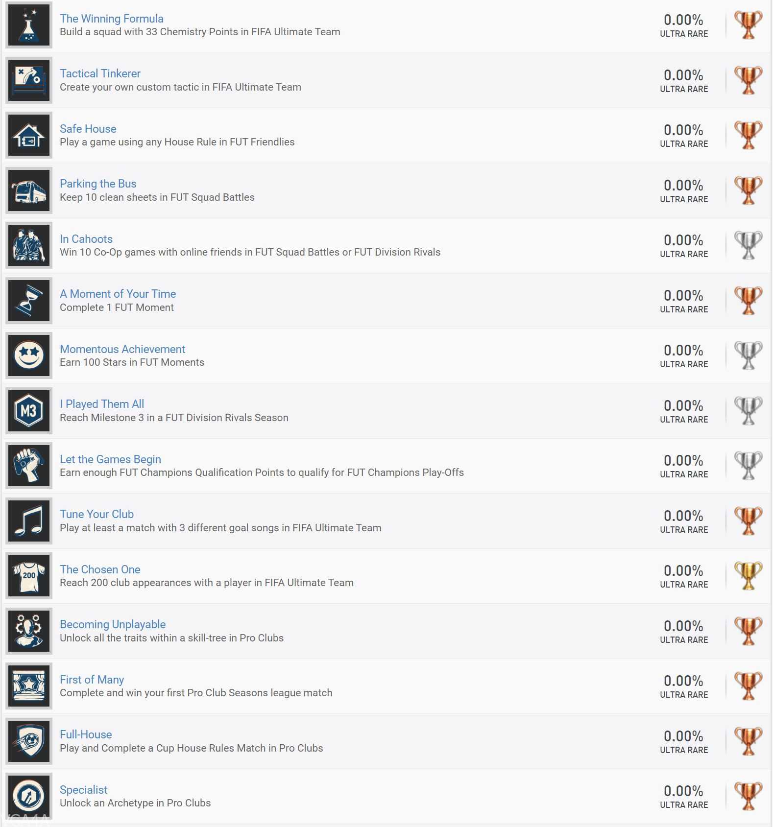 هذه المرة وعلى عكس العديد من الأجزاء الماضية، لن يكون الحصول على الجائزة البلاتينية بتلك الصعوبة، فكل ما في الأمر هو أنك ستكون بحاجة إلى إكمال مجموعة من لحظات طور الـ FUT، واجراء بعض التحديات الصغيرة الجديدة في Ultimate Team، بالإضافة إلى التحكم في مدير مع فريقه الأصلي لموسم كامل.