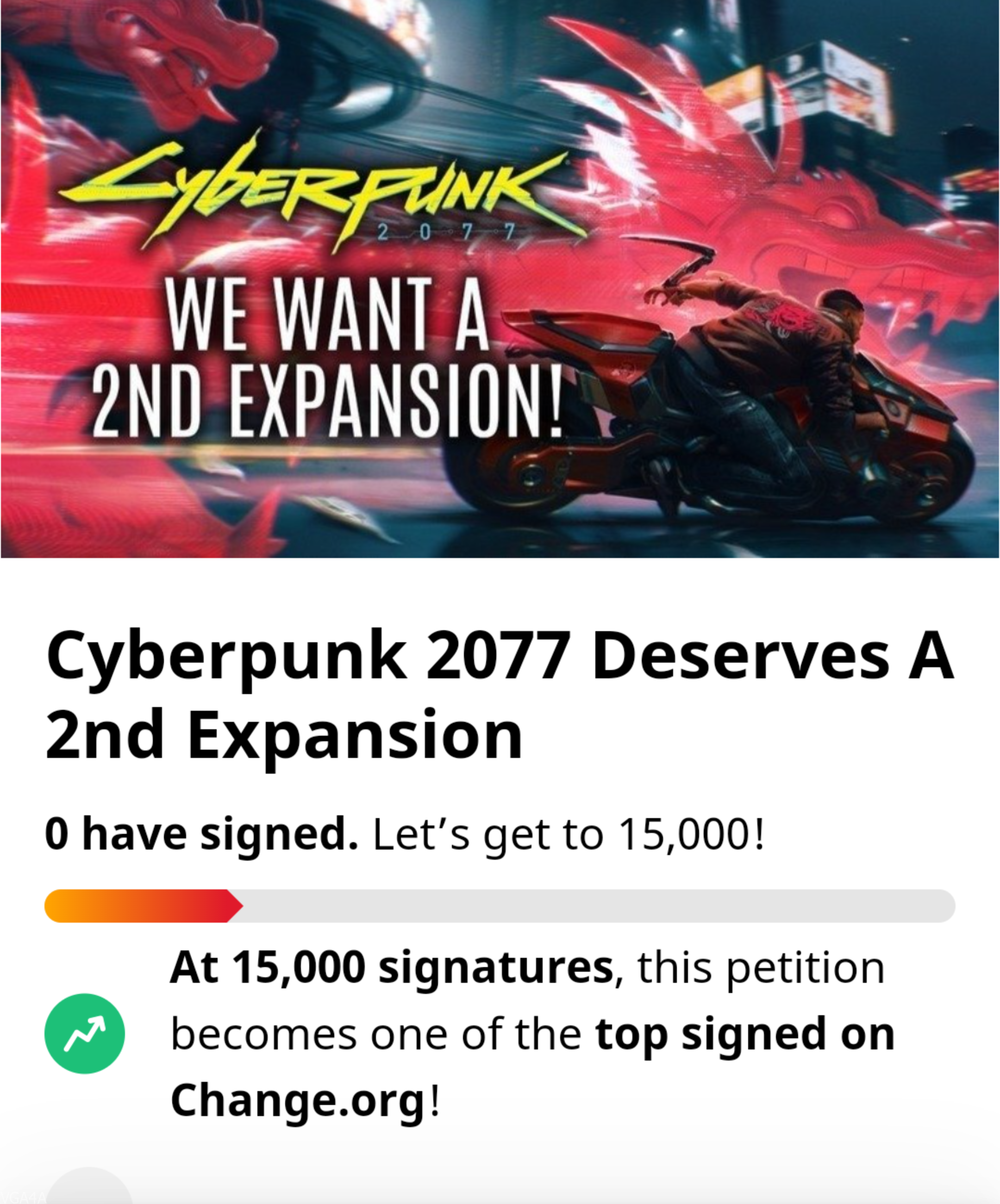 قام عشاق ومحبي لعبة Cyberpunk 2077 بتوقيع عريضة من أجل مطالبة فريق التطوير بالعمل على المزيد من المحتويات الإضافية لها.