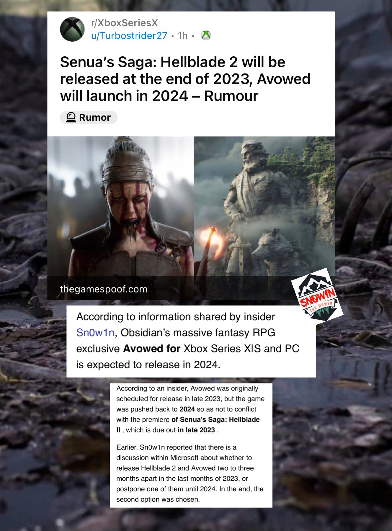 تسريب جديد كشف عنه المطلع والمسرب Sn0w1n عبر حسابه في تويتر، يفيد بأن لعبة Hellblade 2 سيتم إطلاقها في أواخر عام 2023، وهي إحدى الأسباب الرئيسية التي تم لن تصدر فيها لعبة تبادل الأدوار الجديدة الجديدة من تطوير استديو Obsidian Entertainment خلال العام المقبل، وسيكون من المقرر إصدارها في أوائل عام 2024.