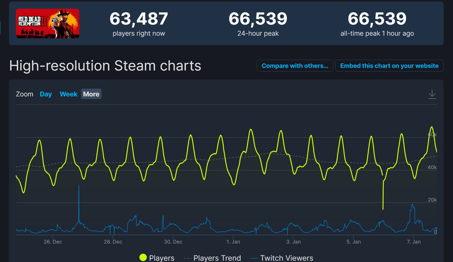 حصلت لعبة Red Dead Redemption على خصومات كبيرة بمناسبة موسم العطلات “Holiday Sale” على متجر Steam الذي انتهى اعتبارًا من تاريخ 5 يناير، والرسم البياني بالأسفل يشير الى أن أداء اللعبة خلال الشهر الماضي كان مرتفعًا جدًا على عكس السنوات الثلاث الماضية. حيث كانت اللعبة تتراوح ما بين 12000 إلى 30.000 لاعب متزامن في ذروتها منذ إطلاقها في عام 2019.