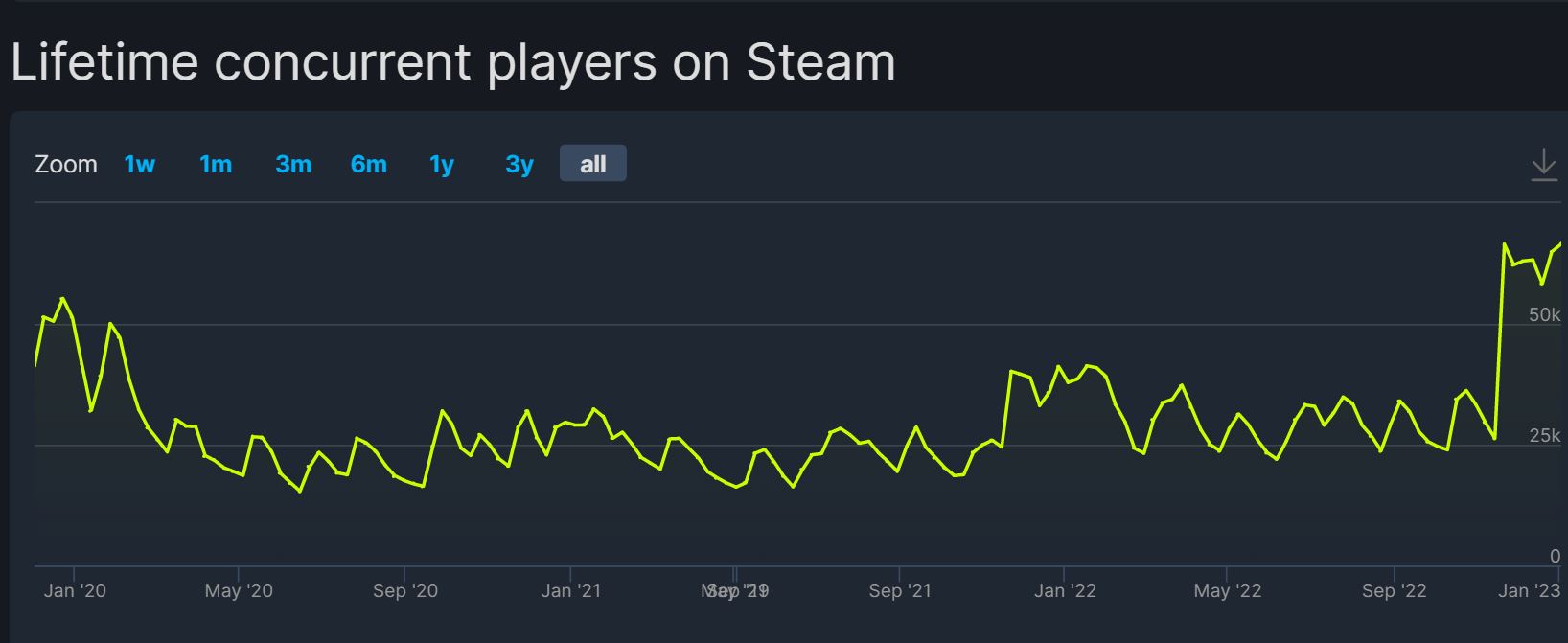 الرقم القياسي الجديد الذي حققته اللعبة مؤخرًا وتم تسجيله هو حوالي 66539 لاعبًا متزامنًا في نفس الوقت وفقًا لما شاركته منصة SteamDB، وهو رقم مثير بالنسبة للعبة صدرتا منذ عدة سنوات، وتخلى المطور عن إضافة محتويات وأطوار جديدة لطور الاونلاين للعبة. سر ذلك يكمن في العروض الأخيرة التي حصلت عليها اللعبة.