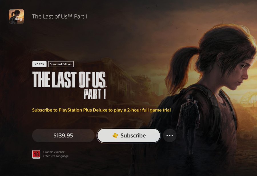 بشكل مفاجئ، ظهرت لعبة The Last of Us Part 1 ضمن خدمة بلايستيشن بلس PS Plus بريميوم أو ديلوكس، بحيث يمكن تجربتها لقرابة ساعتين ومن ثم نقل تقدمك إلى النسخة الكاملة في حال قررت شراءها.