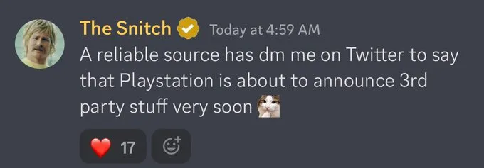 تحدثت الشائعات الأخيرة عن وجود عناوين جديدة حصرية ستعلن عنها شركة سوني وهي تحت التطوير في الوقت الحالي. ومع ظهور المسرب The Snitch من خلال منصة Discord بمعلومة هامة وفي وقت حساس، والتي تحدثت عن أن بلايستيشن على وشك الإعلان عن عنوان من قبل شركة من الطرف ثالث “قريبًا جدًا”.