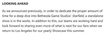 موقع GamesRadar رصد منشور تابع لحساب منصة اكسبوكس وهو يذكر اللاعبين بما تم عرضه خلال حدث المطورين. في نهاية المنشور، تم ذكر جملة سنعود خلال “الاستعراض السنوي” الكبير مع عرض أعمق للعبة Starfield والمزيد.