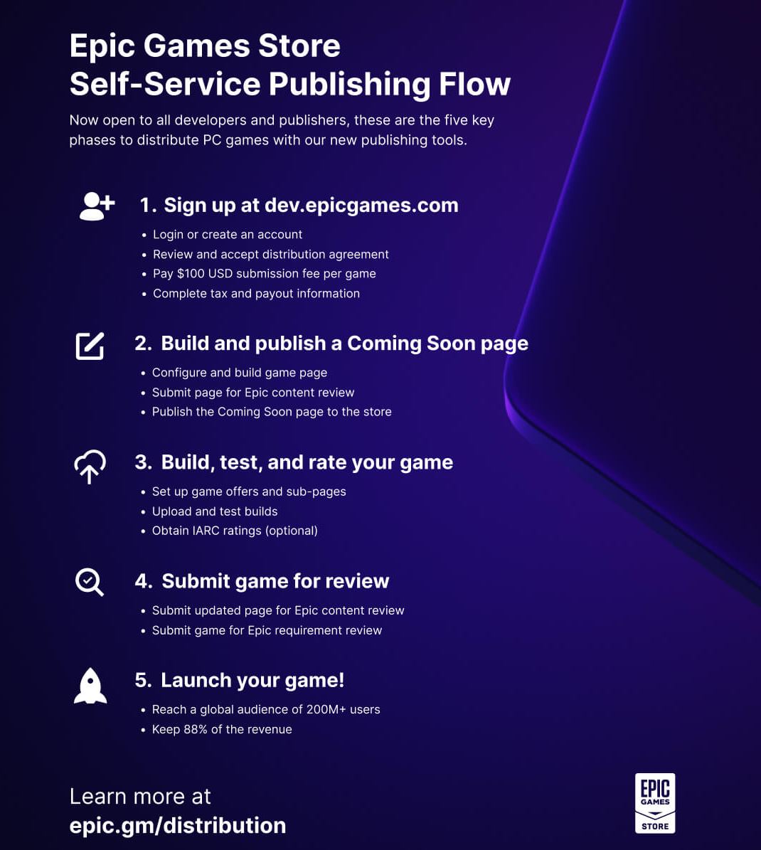 - يحصل الناشرون على 88% من إيرادات الألعاب المباعة من خلال Epic Games Store مع خيار استخدام حل الدفع الخاص بك أو حل الدفع من طرف ثالث للحصول على 100% من إيرادات عمليات الشراء داخل التطبيق.