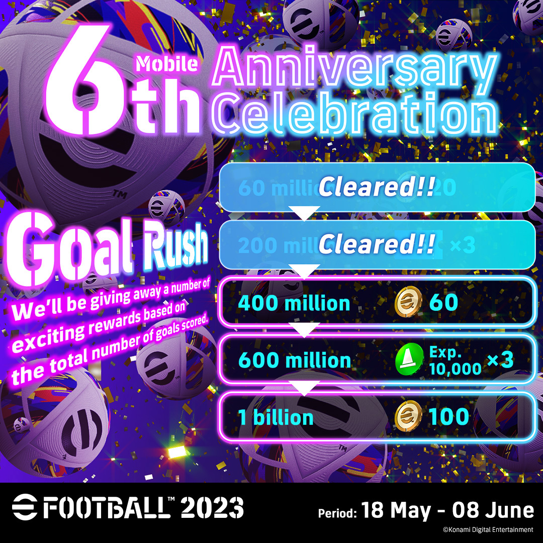مؤخراً، احتفلت لعبة eFootball نسخة الهاتف المحمول بمرور 6 سنوات على إطلاقها على المنصات المحمولة، وبمناسبة ذلك، قدم المطور أيضاً مجموعة من الهدايا الى جميع اللاعبين عند تسجيل الدخول، مثل بطاقة Show Time للاعب Bruno Fernandes بالإضافة الى الحملات والتحديات وأحداث الجولة وغيرها.
