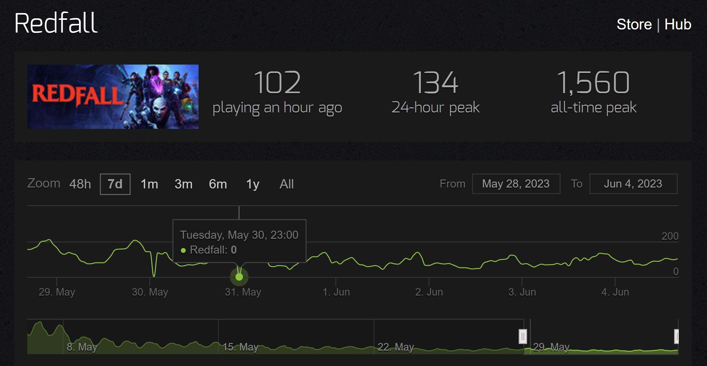 من خلال منصة Steam Charts المتخصصة في جمع ببيانات وإحصاءات اللاعبين، ظهر أن لعبة التصويب Redfall وصلت الى مرحلة الاختفاء التام للاعبين النشيطين أو المتزامنين، ففي تاريخ 30 ماي الماضي، لم يكن هناك أي لاعب يلعب اللعبة على الإطلاق، أي “صفر” في أعداد اللاعبين.