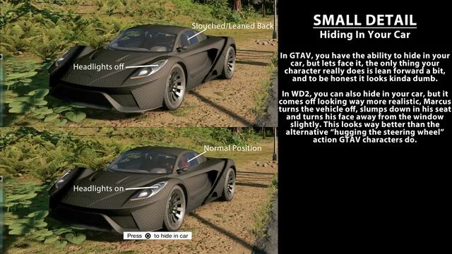 صحيح ان هذه الميزة تواجدت في لعبة GTA 5 لكن يعتقد المعجبون انها كانت بسيطة وخالية من اي واقعية، بينما في Watch Dogs 2 كانت اكثر واقعية حيث يمكن لبطل اللعبة ان يوقف محرك السيارة والانخفاض خلف المقود والانحناء بعيداً عن النافذة.