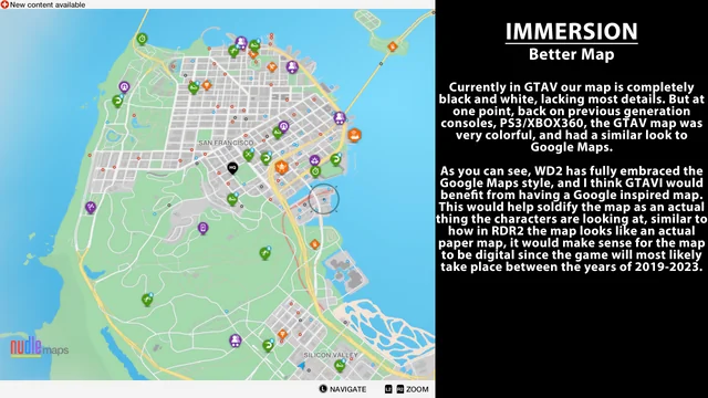 كون احداث لعبة GTA 6 تدور في العصر الحديث فيتوقع اللاعبين ان تكون الخريطة المكبرة وحتى المصغرة تحتوي على تفاصيل اكثر كما هو الحال مع خرائط جوجل مثلاً. ايضا يمكن للاعبين رصد رجال الشرطة من خلال الخريطة المصغرة في جميع الاوضاع مما يساعدهم على تجنب الاحتكاك بهم قدر الامكان.